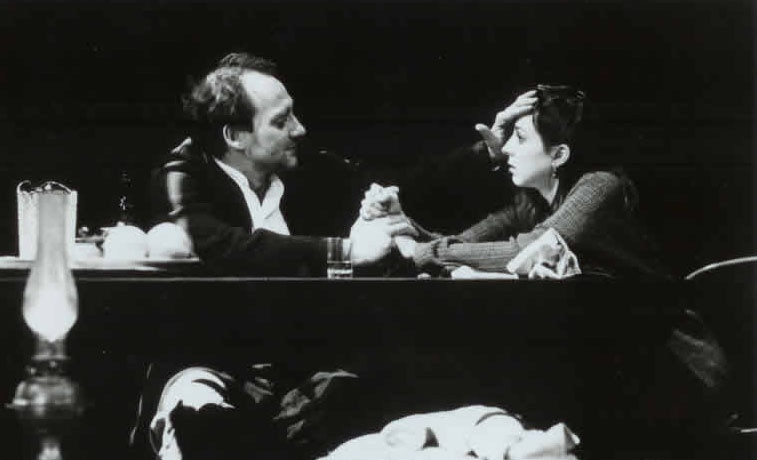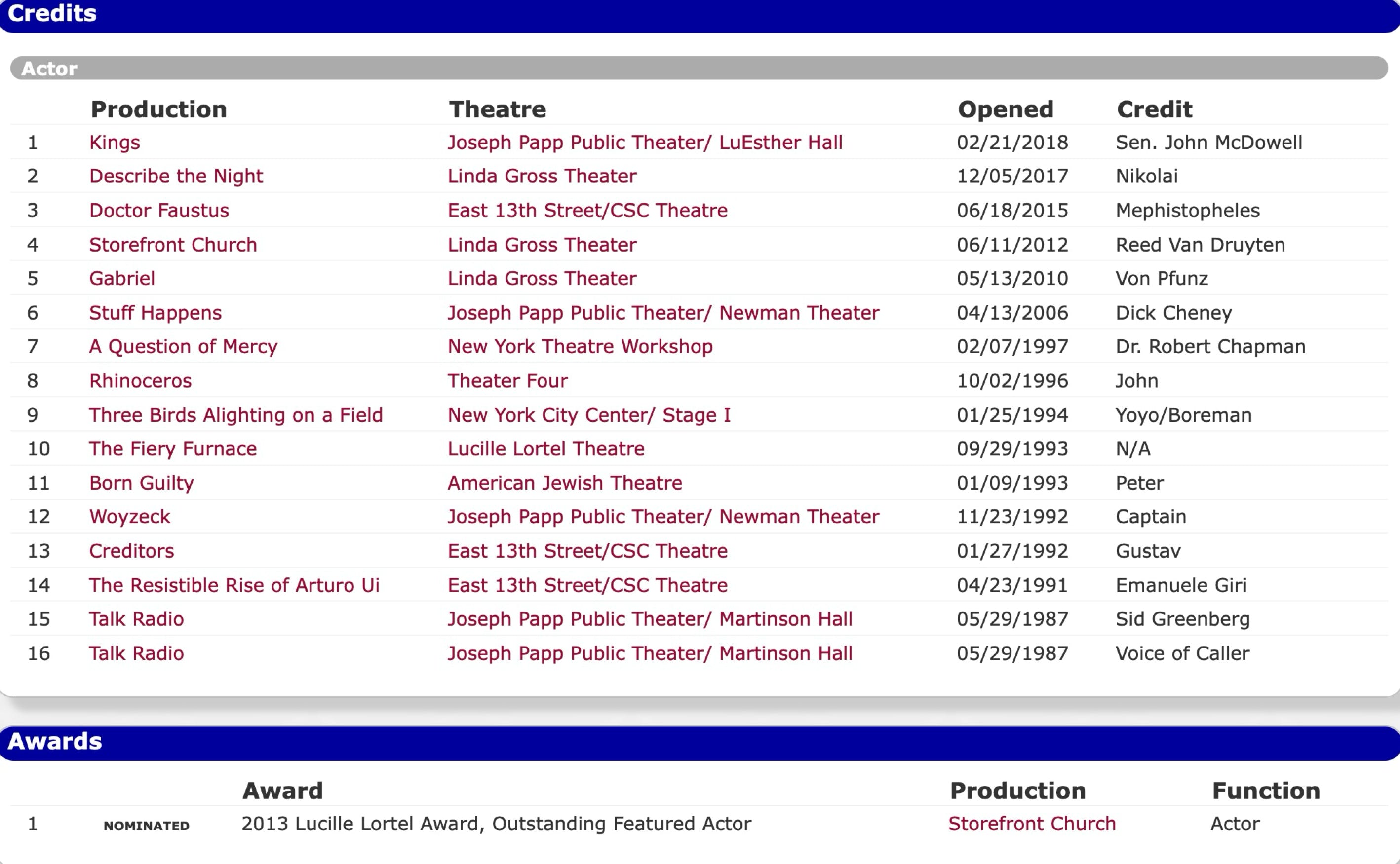 He also appeared in New York experimental theatre as Baal in the Brecht play by that name, in Richard Foreman's The Cure, Jeffrey Jones' Der Inca von Peru and Tomorrowland, Kathy Acker's Birth of the Poet, directed by Richard Foreman, and Mac Wellman's Sincerity Forever. In 1988, he performed the on-stage character Sid Greenberg as well as multiple voice roles in Eric Bogosian's Talk Radio at the Public Theatre. His chameleon tendencies next proved useful in the Broadway production of Larry Gelbart's Mastergate, in which he played all four lawyers in the play. He worked with Julie Harris in Tim Mason's The Fiery Furnace at Circle Repertory Theatre and Dame Harriet Walter in Three Birds Alighting on a Field at the Manhattan Theatre Club.
