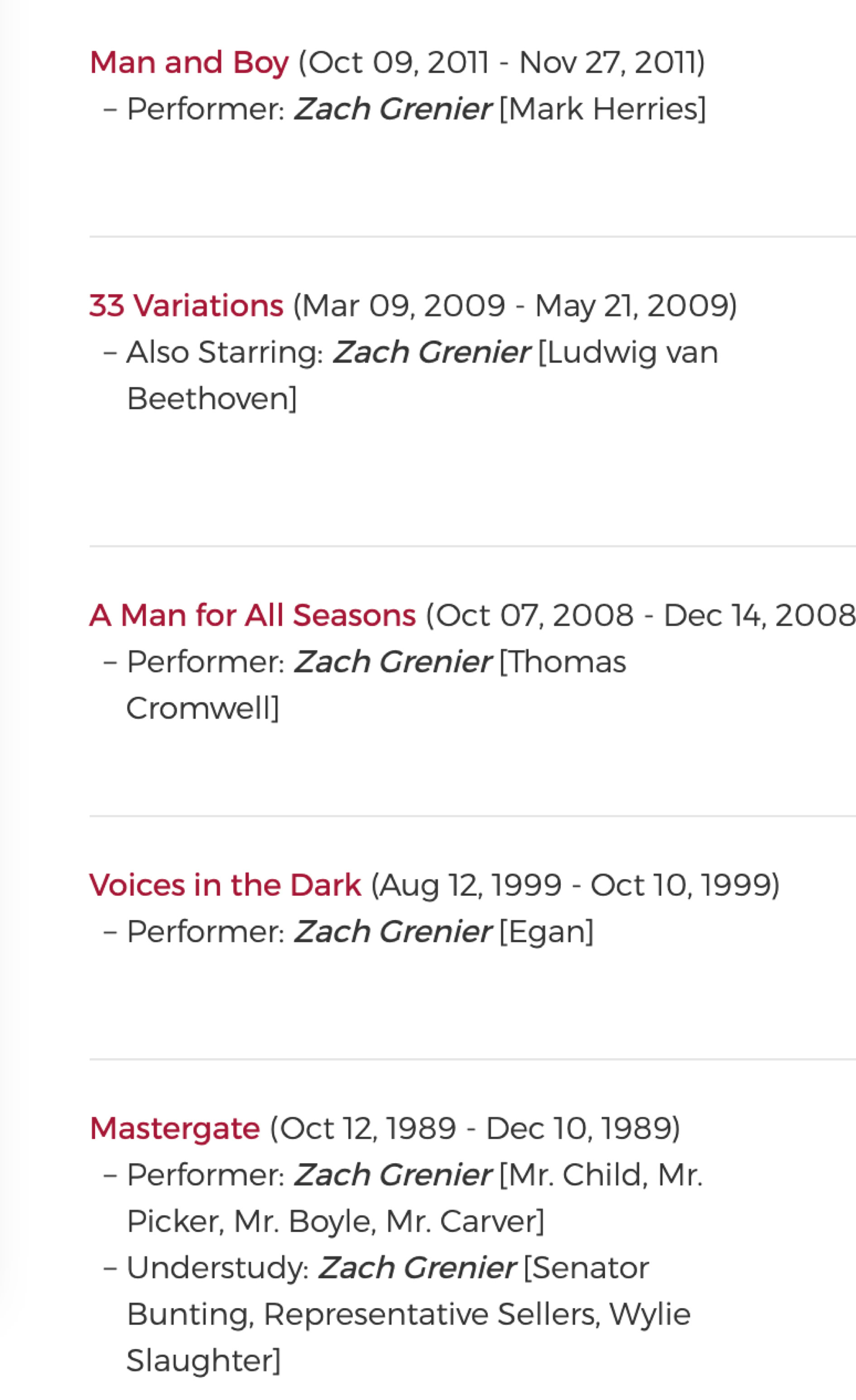 It was not long after that inspiring experience that he found himself cast as Beethoven in Moises Kaufman's 33 Variations at La Jolla Playhouse. These theatrical experiences were the impetus for a move back to the NYC area. Shortly after his return, he found himself back at EST in Vern Thiessen's Lenin's Embalmers. Later that year, 33 Variations moved to Broadway, with Jane Fonda leading the cast. Zach's performance as Beethoven brought him a Tony Award nomination.